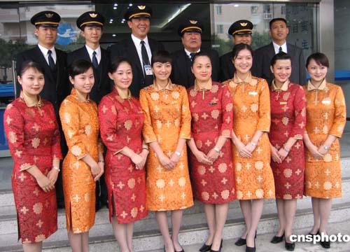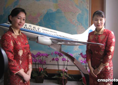 厦航台商春节包机上的空姐,大都来自厦门等闽南地区,将身着改良的唐装提供闽南话服务。图为一月二十七日包机空姐身着新装亮相。作者:杨伏山