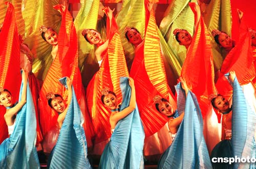 春节即将来临,由解放军创作和演出的2005年军民迎新春文艺晚会“春绿大地情满怀”正在加紧排练。这台晚会由解放军总政治部调集全军优秀创作人员参与策划和创作,并由来自全军文艺团体和解放军仪仗大队及武警官兵的近七百名演职员,组成强大的演出阵容。图为舞蹈演员在排练中。作者:王丽南