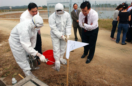 香港渔护署昨日将湿地公园二期暂时封闭,除职员外禁止闲杂人士进入。两名穿上全副保护白袍的工作人员,在其它同事协助下,先确定有关蚁穴的位置,再插上木柱作识别,然后用泥耙扒松泥土,由其中一人将已稀释的杀虫水,灌入蚁穴内,将蚁后杀死“灭族”。另一人则在旁喷洒杀虫水,以防蚂蚁爬上同事身上伤人。在上址上班的员工则表示,在郊野发现蚁穴的情况十分普遍,只要备妥杀虫水,便不会有问题。