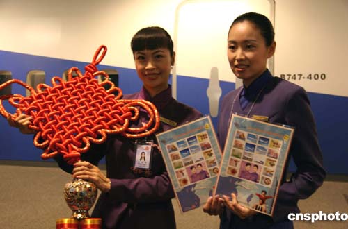 台湾“华航”为此次首航北京春节包机活动,特别与桃园邮局合作设计了二OO五年“华航两岸春节包机纪念邮票”。邮票中除了有“相逢自是有缘,华航以客为荣”的空服形象,另有五款“华航”目前机队机型及此次春节包机航站图等。它们将作为礼品赠与此次搭乘“华航”春节包机的旅客。作者:邢利宇