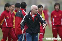 一月二十九日,中国女足在泉州对阵对阵德国队前进行训练。图为中国女足技术顾问基斯·布伦特向女足队员讲解战术。作者:盛佳鹏