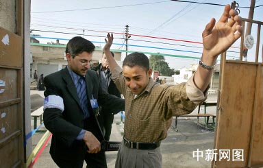 1月30日,在伊拉克南部城市巴士拉,一名男子在进入投票站之前接受检查。当地时间1月30日上午7点,伊拉克各地投票点向选民准时开放,伊拉克半个多世纪以来的首次大选拉开了序幕。