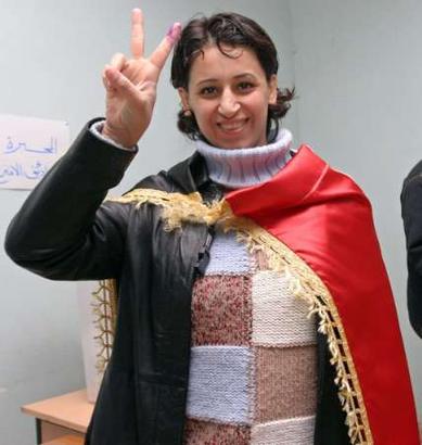 1月30日,一名伊拉克妇女在巴格达一处投票站投票后打“V”手势,展示自己涂上颜料的手指。每位参加投票者在投票后都要在手指上涂上颜料作为标记。