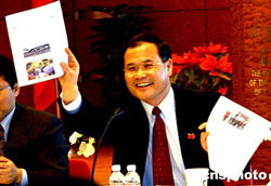 图为中国驻纽约总领事刘碧伟举着自己从网站上打印下来的有关两岸春节包机首航成功的报道和纽约华人一起分享喜悦。