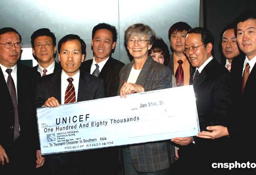 当地时间一月三十一日,美东华人社团联合总会和华人社团联席会向联合国儿童基金会捐赠了十八万美元,用于救助东南亚海啸灾民。联合国儿童基金会执行主任卡罗·贝拉米女士(中)代表联合国儿童基金会接受捐款。作者:赵海燕
