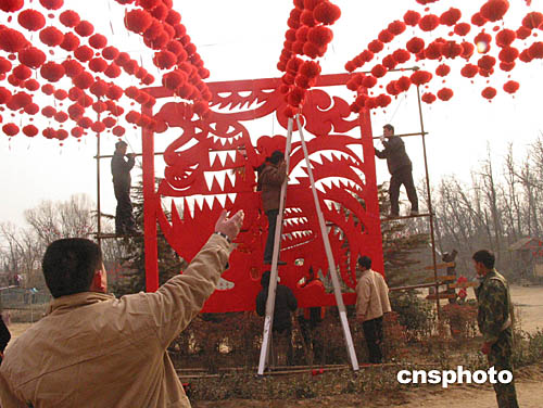 二月一日,一幅直径四米的中国剪纸《吉祥如意图》在河南郑州搭建完毕。这是为2005春节商城民俗文化庙会主会场而建。该剪纸根据中国传统剪纸技法、经过三天的时间精心设计制作出来的,在历年同类庙会中,该图最大。春节庙会结束后将申请吉尼斯世界记录。作者:慎重