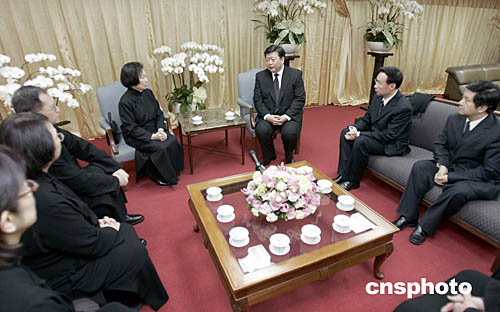 孙亚夫、李亚飞今天下午抵达台北,四点三十五分前往灵堂吊唁辜振甫先生。图为吊唁后与其家人座谈。(台湾海基会故董事长辜振甫先生治丧工作小组提供)中新社记者:邢利宇