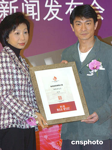 展示香港旅游特色的电视专题片《星星细语香港情》2月1日在香港开镜﹐在新闻发布会上﹐香港旅游发展局总干事臧明华(左)向在剧中担任主角的刘德华致送委任状。
