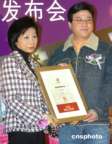 展示香港旅游特色的电视专题片《星星细语香港情》2月1日在香港开镜﹐在新闻发布会上﹐香港旅游发展局总干事臧明华向在剧中担任主角的“网络精英”丁磊(右)致送委任状。