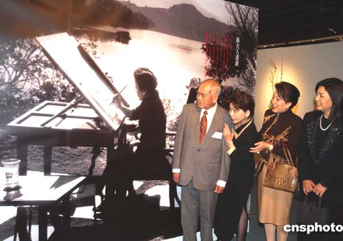 “世纪蒋宋美龄文物展”二月一日在美国洛杉矶开幕。宋美龄孙媳蒋方智怡(右一)、宋家代表宋曹琍璇(右二)与《世界日报》社长苏民生夫妇一起,观赏宋美龄创作国画的巨幅照片。作者:贾国荣