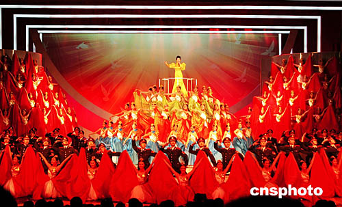 由七百多名解放军及武警官兵参演的2005年军民迎新春文艺晚会《春绿大地情满怀》,二月二日晚在北京中国剧院举行。中国国家主席胡锦涛、吴邦国、温家宝等国家领导人与首都军民欢聚一堂,共贺新春。图为解放军总政治部歌舞团大牌演员彭丽媛的压轴节目《高歌向明天》的表演。中新社记者:王丽南