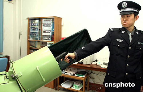 广东省肇庆市公安局警员正在使用“移动式小型消声抓弹器”。该市公安局研制的移动式小型消声抓弹器填补了国内空白。利用该装置,警方可在不损伤、不破坏弹道痕迹的前提下,快速有效地提取从枪膛中高速射出的弹头。中新社图