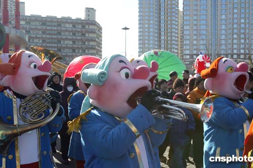 二月九日中国传统春节,尽管天寒地冻,但是在北京朝阳公园的国际风情节上却激情燃放。当天开幕的二零零五年北京朝阳国际风情节,为京城的市民奉献了一台中西文化大餐。图为开幕式上盛装游行队伍中的卡通乐队。作者:任海霞
