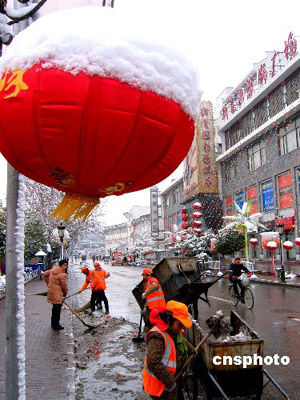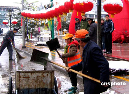 2月12日农历正月初四,经过一夜的大雪,南京夫子庙旅游景区的路面上铺满了积雪。为了确保游人安全,秦淮区环卫所的工人们一清早就开始清扫路面积雪和打捞秦淮河上的漂浮物,许多市民也加入到扫雪行列。作者:孙忠南
