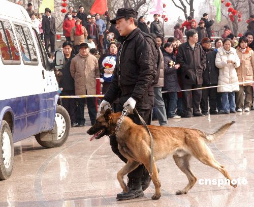 北京警方在春节期间增加了一项特殊工作,二月十二日公安警犬队训犬员,乘警车,牵警犬在第二十二届春节龙潭庙会主会场,为千名游园观众表演警犬搜捕、跨越障碍、缉毒、擒敌等节目。作者:邹宪