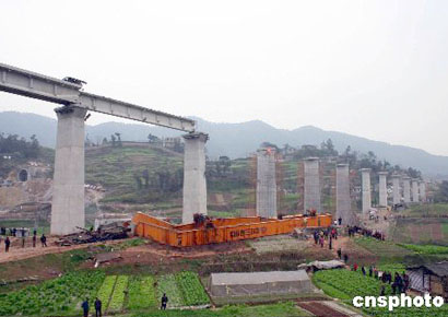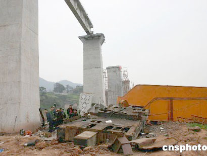 今天上午八点三十分左右,正在施工中的遂渝铁路北碚区东阳谢家湾段铺轨车突然发生翻塌,造成施工现场四名工人当场死亡,八人受伤,其中二人因伤势过重,经全力抢救无效死亡。