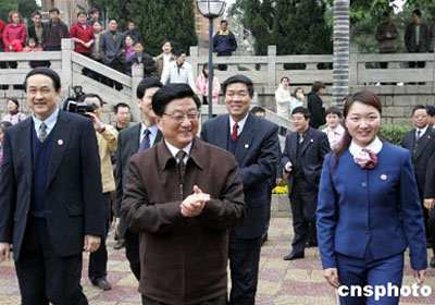 二月八日至十四日,中共中央政治局常委、国务院副总理黄菊一行在福建进行考察。图为二月九日农历大年初一那天,黄菊在福州船政文化主题公园罗星塔园里向市民拜年,祝大家新春愉快。作者:杨婀娜
