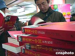 美国人罗伯特.劳伦斯.库恩博士所著的《他改变了中国:江泽民传》,春节之前一面市便受到广大书友的追捧。图为2月17日北京西单图书大厦内几位读者正在聚精会神地看书。作者:纳梦月