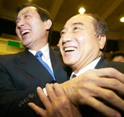 中新网2月24日电 据台湾媒体报道,国民党主席连战夫妇昨晚返回台湾,约有近四十名“立委”及七十名党部人员前往接机,党主席热门人选的“立法院长”王金平、台北市长马英九都提早在机场等待,亲民党则派出秘书长秦金生、“立院”党团总召集人刘文雄到场接机,王马两人还多次互相拥抱,展现团结气氛。