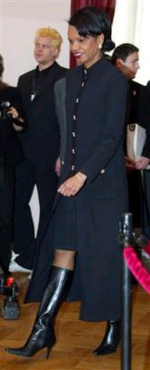 赖斯走下飞机,沿着列队欢迎她的德国仪仗队走过去,她所穿的黑色外套被风吹起,露出脚上一双齐膝的长筒靴子。靴子的跟很高、很细,非常性感。