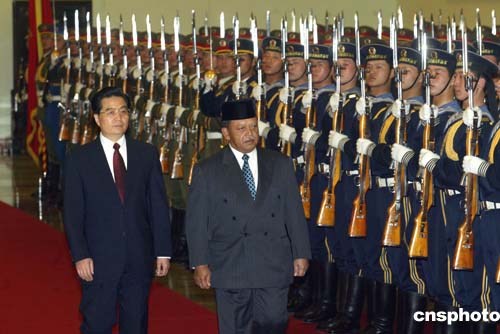 中国国家主席胡锦涛二月二十八日在北京人民大会堂会见来访的马来西亚最高元首西拉杰丁。作者:史利