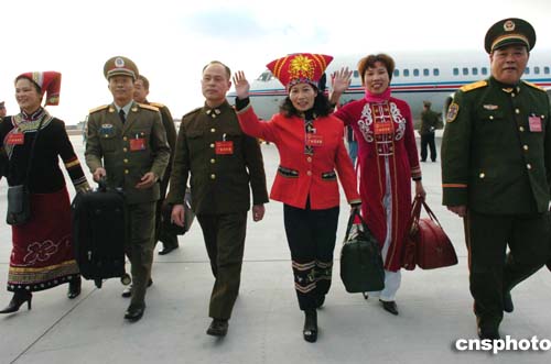 三月二日,参加十届全国人大三次会议的各地人大代表陆续抵达北京,图为来自广西的少数民族代表与军队代表一起走出北京西郊机场。作者:陈文