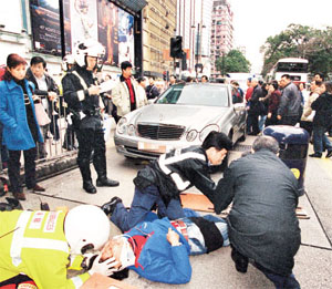 袁洁莹昨晨十一时许,驾驶银色平治房车沿漆咸道南向尖沙咀行驶,途至金马伦道对开交通灯位时,一名五十二岁菲籍女子突然由行人路道走出欲过马路,Fennie刹车不及将对方撞倒地上,她立即停车报警。