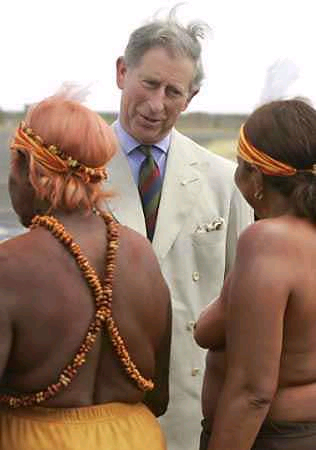 3月2日,查尔斯前往澳大利亚内地进行访问。王储一抵达爱利斯泉,就由赤裸着上身的土著妇女热情迎接,王储看得两眼不知该往哪里瞧才好。土著人又给他端上一桌虫虫大餐,更让王储吃不消。