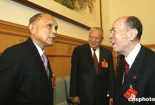 全国政协十届三次会议三月三日在北京开幕,全国政协副主席霍英东、马万祺与香港特首董建华在出席大会时互致问候。作者:廖文静
