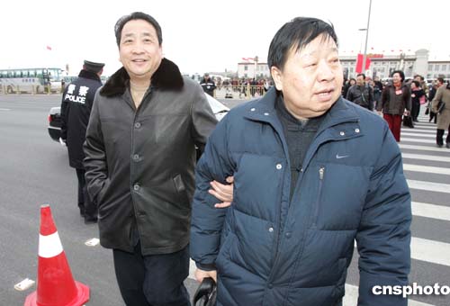 全国政协十届三次会议三月三日下午在北京人民大会堂开幕,马季、姜昆师徒一起步入会场。作者:毛建军
