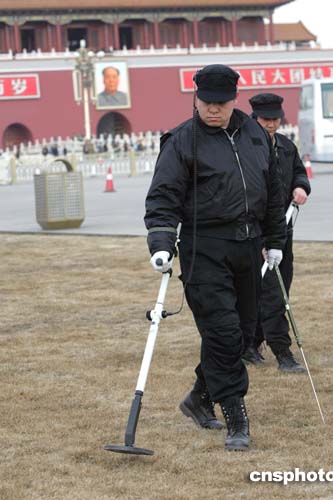全国政协十届三次会议三月三日下午三点在北京人民大会堂隆重开幕,会议开始前,警员对天安门广场进行安全检查。作者:毛建军