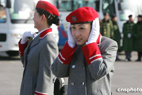 十届全国人大三次会议三月四日在北京人民大会堂举行预备会议,由于冷空气来临,负责导引代表参会的礼仪小姐在天安门广场上显得“美丽冻人”。作者:汤彦俊