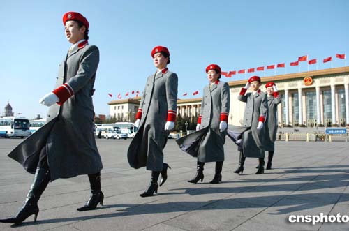 三月四日,为十届全国人大三次会议服务的北京会议中心礼仪小姐亮相天安门广场。作者:陈文