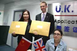 三月四日,姬脉锦女士(左一)在英国签证申请中心(重庆)替父母领取到了赴英旅游签证。姬女士父母的赴英旅游签证,是英国驻重庆总领事馆签证处在中国西南地区签发的首张赴英签证。英国驻重庆总领事馆签证处和英国签证申请中心(重庆)于本月三日正式开始工作,向居住于重庆、四川、云南和贵州等的中国公民提供赴英签证服务。作者:郭晋嘉