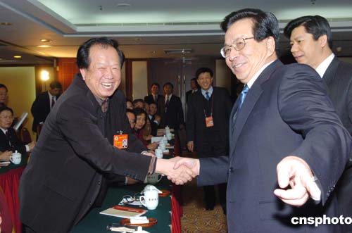 三月四日,中共中央政治局常委、国家副主席曾庆红到北京华润饭店参加全国政协民进、民盟联组会议时,应著名导演李前宽的要求与其握手。作者:陈文