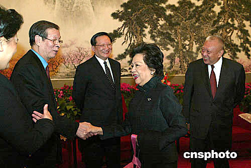 国家主席胡锦涛三月五日在北京会见香港特别行政区行政长官董建华,国务委员唐家璇、国务院港澳办主任廖晖等在会见后与特首夫人互致问候。作者:满会乔