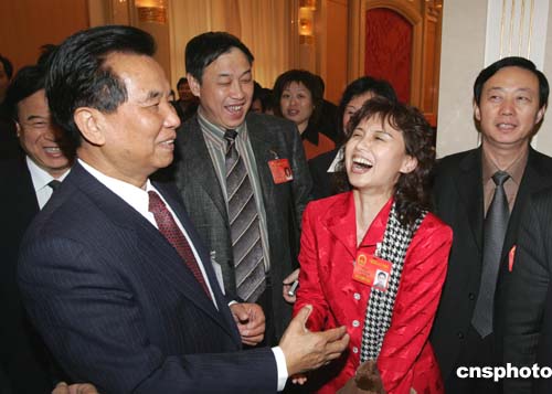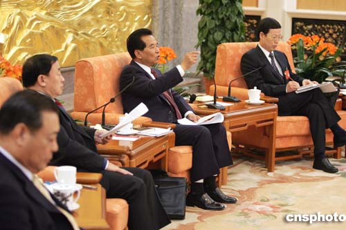三月六日,中共中央政治局常委吴官正在北京人民大会堂与出席十届全国人大三次会议的山东代表一起审议政府工作报告。作者:毛建军