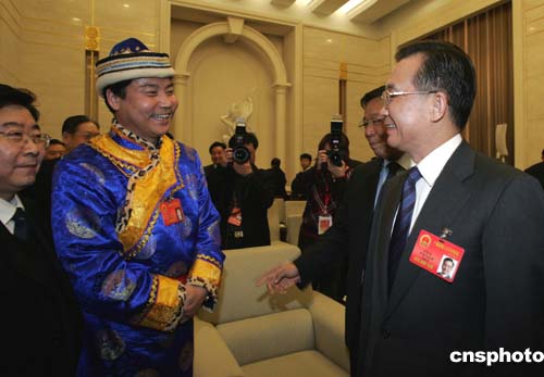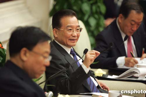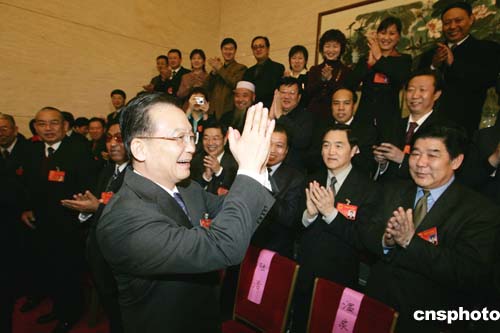 国务院总理温家宝三月五日下午与出席十届全国人大三次会议的甘肃代表一起审议政府工作报告。作者:毛建军