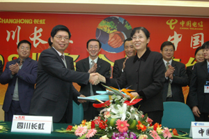 中新网3月7日电 3月4日,“中国电信-四川长虹4008业务合作签约仪式”在四川省绵阳市隆重举行。长虹电器股份有限公司副总经理邬江与中国电信集团公司大客户事业部梁志平总监代表双方在协议书上签字。