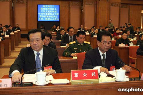 十届全国人大三次会议主席团第二次会议三月七日在北京人民大会堂举行,会议决定将关于接受江泽民辞去中国中央军事委员会主席职务的请求的决定草案提请大会表决。图为曾庆红(左)、吴官正等代表出席会议。作者:毛建军