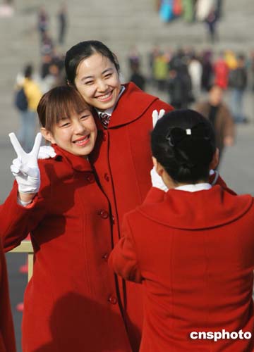 图:“两会”礼仪小姐在天安们广场沐浴三月阳光