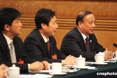十届全国人大三次会议第二次全体大会三月八日在北京人民大会堂举行,会议结束后,各代表团举行全体会议,审议反分裂国家法草案。图为杭州市学军中学校长任继长(右一)代表在会上发言。作者:毛建军