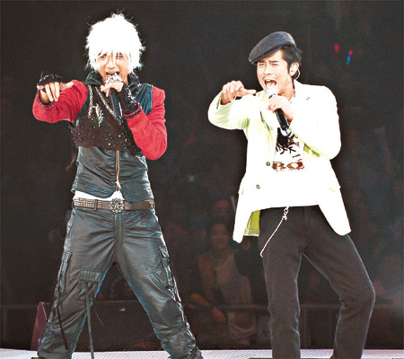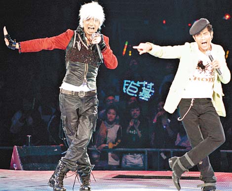中新网3月11日电 据《东方日报》报道,古巨基演唱会前晚邀请了郭富城做嘉宾,两人在台上斗跳劲舞,掀起全场高潮,基仔还笑言在城城身上“采阳补阴”,学成一身舞技,城城搞笑回应:“怪不得我现在变的这么瘦了”令全场大笑。