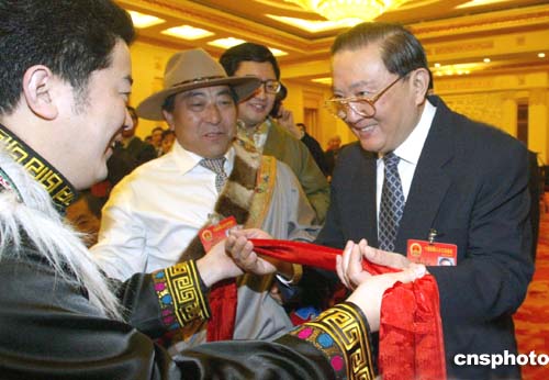 图:四川藏族人大代表向罗干献红色哈达