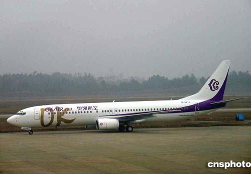 11日上午11时45分,一架从天津滨海国际机场起飞的标有“奥凯”标志的波音737-900飞机,在长沙黄花国际机场降落。这是新中国民航史上第一家获准飞天的大陆民营航空公司,奥凯航空公司的首飞,也标志着中国民营资本奏响角逐中国航空市场的号角。作者:刘双双