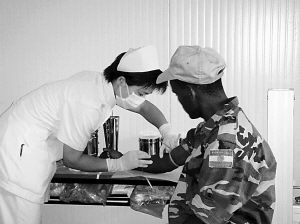 护士长吴乐燕一打开非洲之行的个人相册,一张张照片似乎还在散发着西非大地的灼热。她介绍说,利比里亚因紧邻赤道,阳光中的紫外线强烈,白天的气温有时高达40多摄氏度。医疗分队的女队员们刚刚抵达时,工作起来是汗如雨下,一天下来皮肤就被灼伤变黑,继而脱皮,就连在国内花好几百元准备的防晒化妆品也不管用。从此,爱美的她们干脆把镜子藏进了旅行箱。