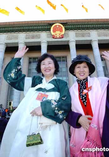 三月十二日下午,全国政协十届三次会议在北京人民大会堂闭幕,全国政协委员朴惠善(左)、李承淑(右)愉快地走出会场。作者:陈文