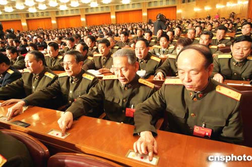 十届全国人大三次会议三月十四日在北京人民大会堂闭幕,解放军代表按表决器通过《反分裂国家法》草案。作者:毛建军
