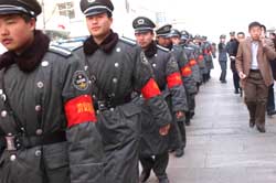 | 北京保安执勤队员三月十五日为“3.15”消费者日大型活动值勤。北京市保安服务总公司是我国成立最早、规模最大的保安服务公司之一。截止2003年8月,总公司所属共有28家保安分公司,1家保安科技发展中心,保安从业人员53000余人,保安人防客户单位4300多家,技防客户单位2100多家,保安服务遍及全市各行各业,包括联合国驻华机构,外国驻华使馆,外国商社,政府机关,金融机构,大专院校,宾馆饭店,商场超市、集贸市场、繁华街区、居民社区等,已初步形成了覆盖全市的、人防与技防紧密结合的新型安全防范网络。作者:邹宪