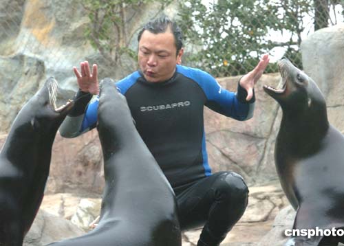 香港海洋公园的喂养员在每日喂海狮之前都要与海狮进行交流﹐以增进感情。作者:赵振清